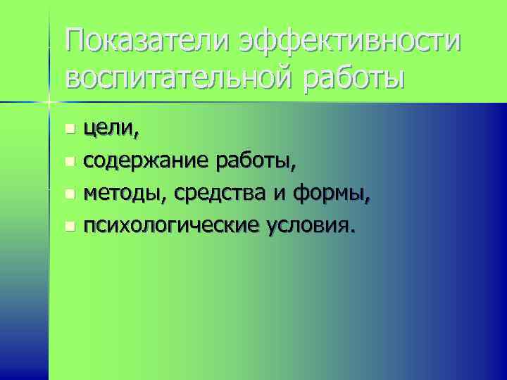 Показатели эффективности воспитательной работы цели, n содержание работы, n методы, средства и формы, n психологические условия. n