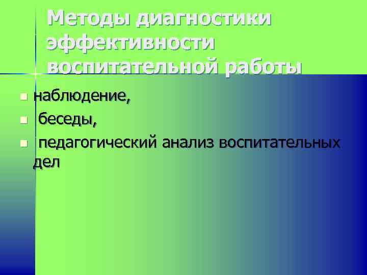 Методы диагностики эффективности воспитательной работы наблюдение, n беседы, n педагогический анализ воспитательных дел n