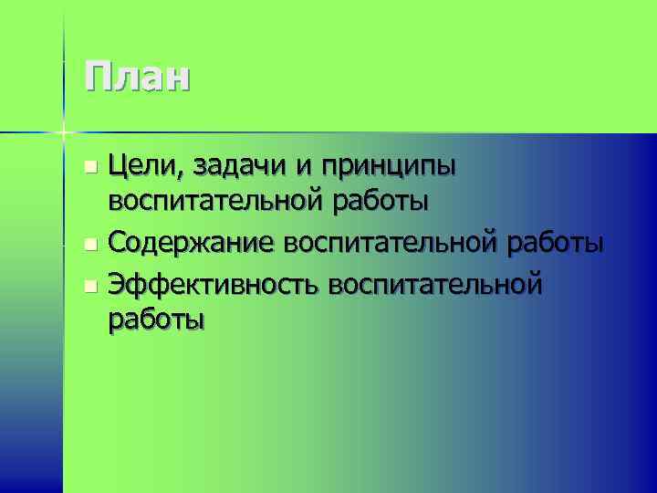 План Цели, задачи и принципы воспитательной работы n Содержание воспитательной работы n Эффективность воспитательной работы n