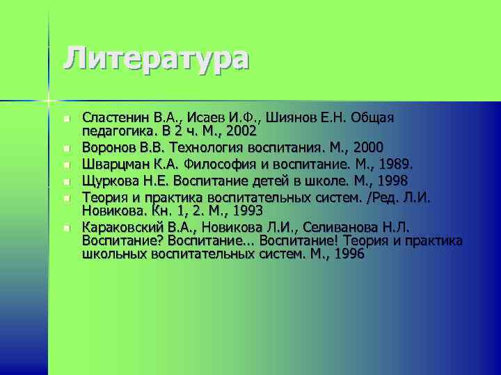 Литература n n n Сластенин В. А. , Исаев И. Ф. , Шиянов Е. Н. Общая педагогика. В 2 ч. М. , 2002 Воронов В. В. Технология воспитания. М. , 2000 Шварцман К. А. Философия и воспитание. М. , 1989. Щуркова Н. Е. Воспитание детей в школе. М. , 1998 Теория и практика воспитательных систем. /Ред. Л. И. Новикова. Кн. 1, 2. М. , 1993 Караковский В. А. , Новикова Л. И. , Селиванова Н. Л. Воспитание? Воспитание. . . Воспитание! Теория и практика школьных воспитательных систем. М. , 1996