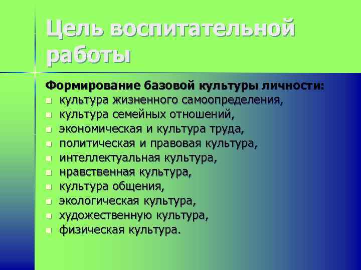 Цель воспитательной работы Формирование базовой культуры личности: n культура жизненного самоопределения, n культура семейных отношений, n экономическая и культура труда, n политическая и правовая культура, n интеллектуальная культура, n нравственная культура, n культура общения, n экологическая культура, n художественную культура, n физическая культура.