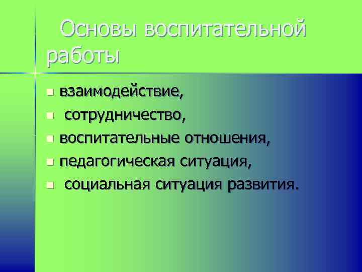 Основы воспитательной работы взаимодействие, n сотрудничество, n воспитательные отношения, n педагогическая ситуация, n социальная ситуация развития. n
