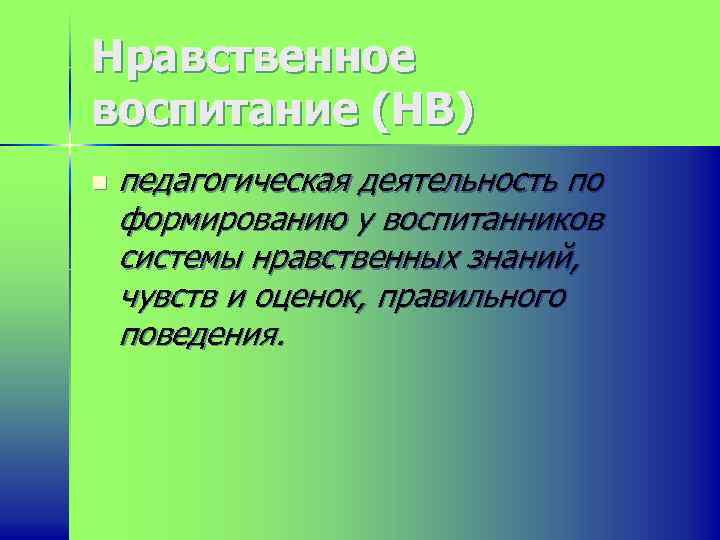 Нравственное воспитание (НВ) n педагогическая деятельность по формированию у воспитанников системы нравственных знаний, чувств и оценок, правильного поведения.