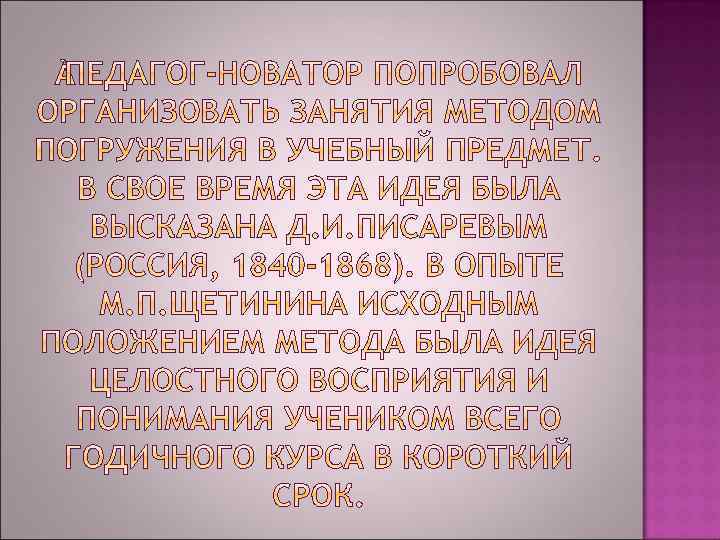 Концептуальной основой дидактической (шире: учебновоспитательной) системы М. П. Щетинина стала идея гармонического сочетания рационального и эмоционального в познавательной деятельности человека.