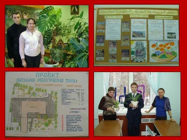 Цель: формирование экологической культуры школьников, формирование практических умений и навыков в природоохранной деятельности. Ø Ø Формы работы: озеленение пришкольного участка, благоустройство школьной территории; подготовка рассады. Озеленение школьных кабинетов и рекреаций; организация и проведение внеклассных мероприятий, конкурсов, предметной недели по экологии, читательской конференции; рейды по проверке состояния комнатных растений.