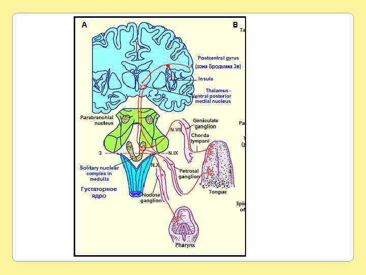 A B Taste area I Postcentral gyrus (зона Бродмана 3 в) Insula Thalamus Ventral posterior medial nucleus Parabranchial nucleus N. VII Geniculate ganglion Chorda tympani 3 Solitary nuclear Ventral posterior medial nucleus Ventral Centromedian posterior nucleus lateral nucleus Parafascicular nucleus Thalamic relay for taste (parvocellular portion of the ventral posterior medial nucleus) N. IX Ventral posterior inferior nucleus N. X Petrosal ganglion complex in medulla Густаторное ядро Taste area II Solitary tract Tongue Nodose ganglion Solitary nucleus Cuneate nucleus Spinal nucleus of trigeminal nerve (V) Inferior olivary nucleus Pharynx Pyrinal tract Nucleus ambiguus