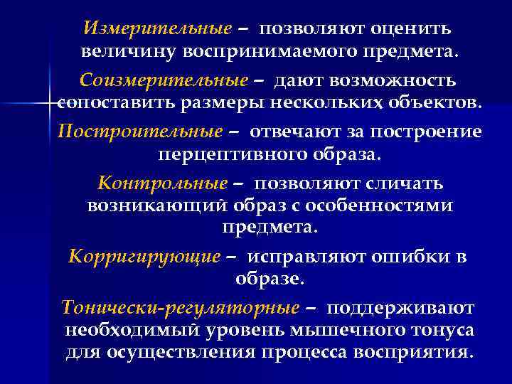 Измерительные – позволяют оценить величину воспринимаемого предмета. Соизмерительные – дают возможность сопоставить размеры нескольких объектов. Построительные – отвечают за построение перцептивного образа. Контрольные – позволяют сличать возникающий образ с особенностями предмета. Корригирующие – исправляют ошибки в образе. Тонически-регуляторные – поддерживают необходимый уровень мышечного тонуса для осуществления процесса восприятия.