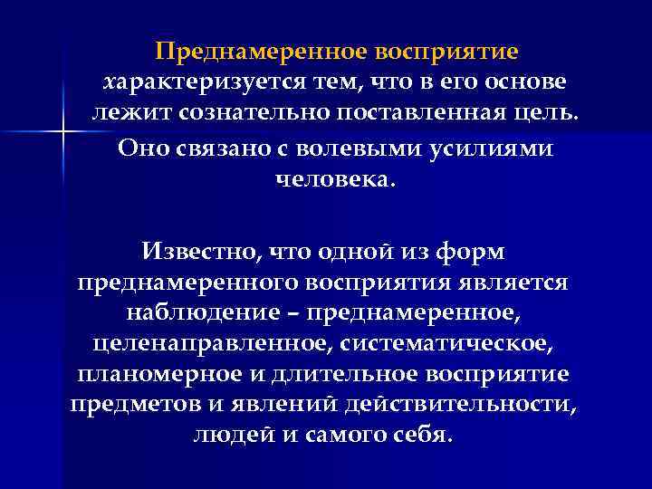 Преднамеренное восприятие характеризуется тем, что в его основе лежит сознательно поставленная цель. Оно связано с волевыми усилиями человека. Известно, что одной из форм преднамеренного восприятия является наблюдение – преднамеренное, целенаправленное, систематическое, планомерное и длительное восприятие предметов и явлений действительности, людей и самого себя.
