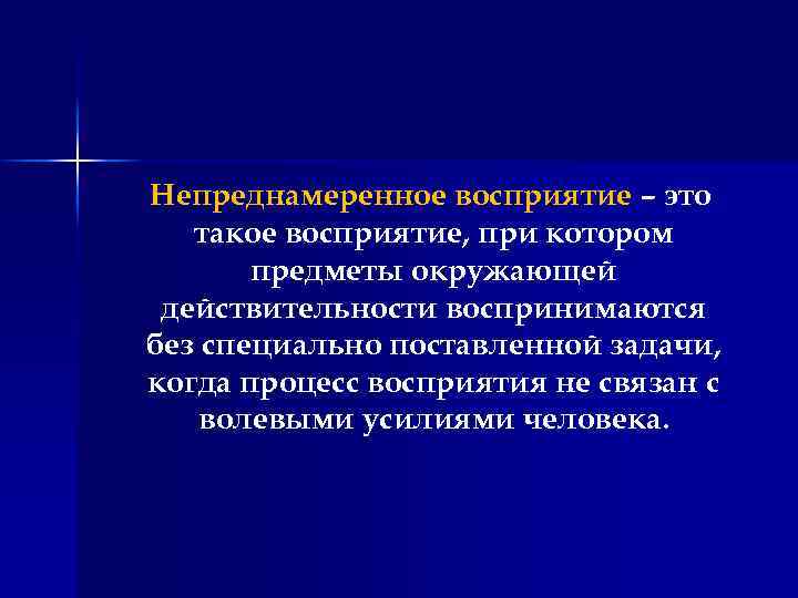 Непреднамеренное восприятие – это такое восприятие, при котором предметы окружающей действительности воспринимаются без специально поставленной задачи, когда процесс восприятия не связан с волевыми усилиями человека.