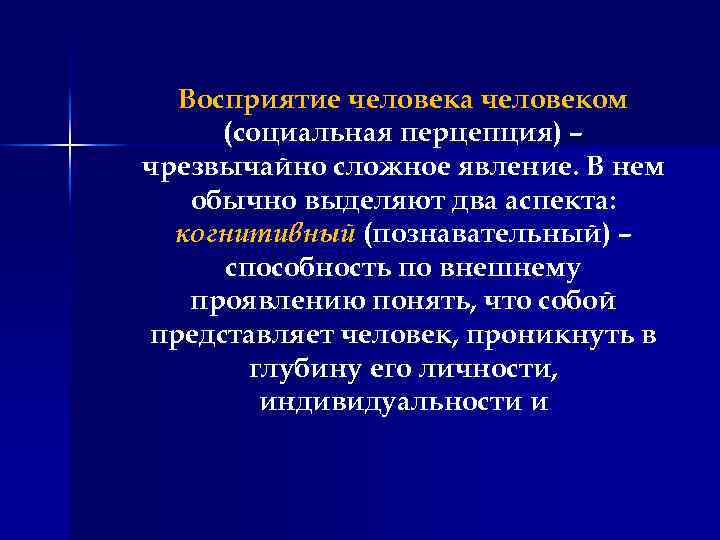 Восприятие человека человеком (социальная перцепция) – чрезвычайно сложное явление. В нем обычно выделяют два аспекта: когнитивный (познавательный) – способность по внешнему проявлению понять, что собой представляет человек, проникнуть в глубину его личности, индивидуальности и