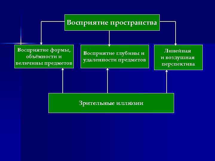 Восприятие пространства Восприятие формы, объёмности и величины предметов Восприятие глубины и удаленности предметов Зрительные иллюзии Линейная и воздушная перспектива