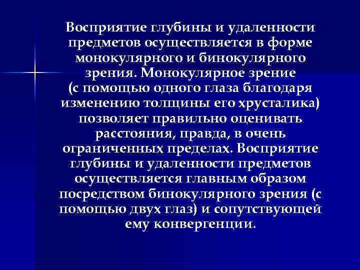 Восприятие глубины и удаленности предметов осуществляется в форме монокулярного и бинокулярного зрения. Монокулярное зрение (с помощью одного глаза благодаря изменению толщины его хрусталика) позволяет правильно оценивать расстояния, правда, в очень ограниченных пределах. Восприятие глубины и удаленности предметов осуществляется главным образом посредством бинокулярного зрения (с помощью двух глаз) и сопутствующей ему конвергенции.
