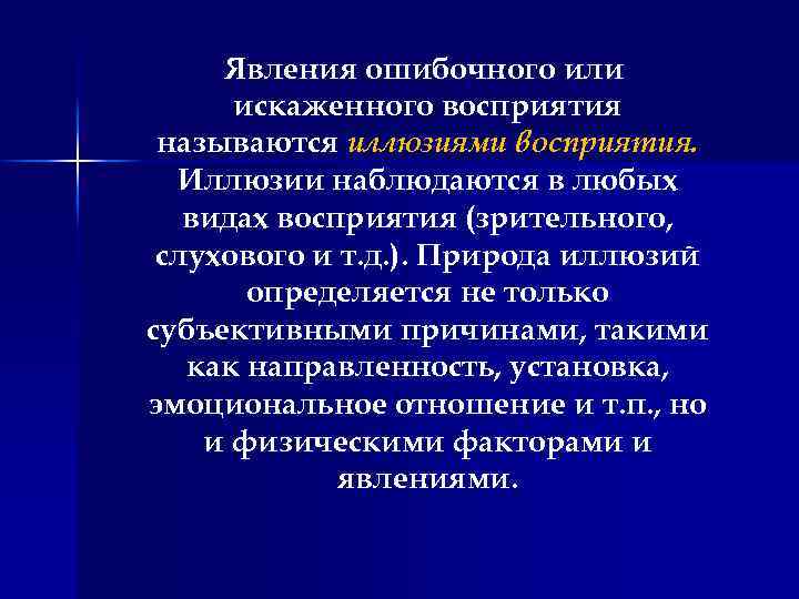 Явления ошибочного или искаженного восприятия называются иллюзиями восприятия. Иллюзии наблюдаются в любых видах восприятия (зрительного, слухового и т. д. ). Природа иллюзий определяется не только субъективными причинами, такими как направленность, установка, эмоциональное отношение и т. п. , но и физическими факторами и явлениями.