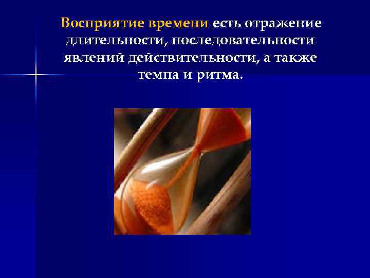 Восприятие времени есть отражение длительности, последовательности явлений действительности, а также темпа и ритма.