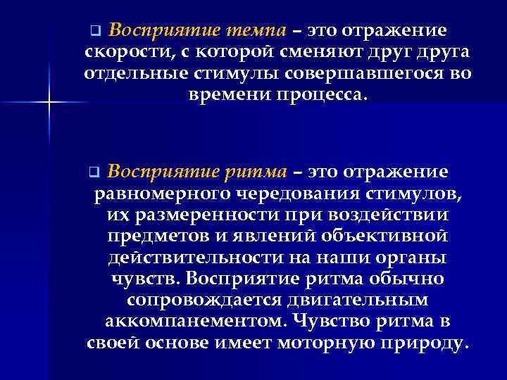 Восприятие темпа – это отражение скорости, с которой сменяют друга отдельные стимулы совершавшегося во времени процесса. q Восприятие ритма – это отражение равномерного чередования стимулов, их размеренности при воздействии предметов и явлений объективной действительности на наши органы чувств. Восприятие ритма обычно сопровождается двигательным аккомпанементом. Чувство ритма в своей основе имеет моторную природу. q