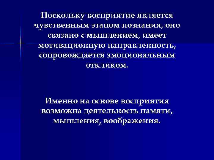 Поскольку восприятие является чувственным этапом познания, оно связано с мышлением, имеет мотивационную направленность, сопровождается эмоциональным откликом. Именно на основе восприятия возможна деятельность памяти, мышления, воображения.