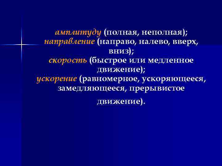 амплитуду (полная, неполная); направление (направо, налево, вверх, вниз); скорость (быстрое или медленное движение); ускорение (равномерное, ускоряющееся, замедляющееся, прерывистое движение).