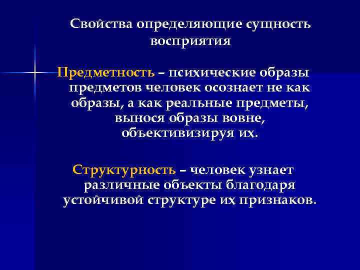 Свойства определяющие сущность восприятия Предметность – психические образы предметов человек осознает не как образы, а как реальные предметы, вынося образы вовне, объективизируя их. Структурность – человек узнает различные объекты благодаря устойчивой структуре их признаков.