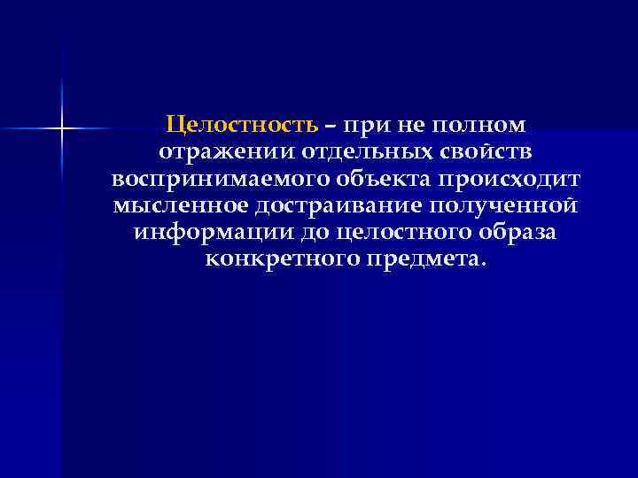 Целостность – при не полном отражении отдельных свойств воспринимаемого объекта происходит мысленное достраивание полученной информации до целостного образа конкретного предмета.