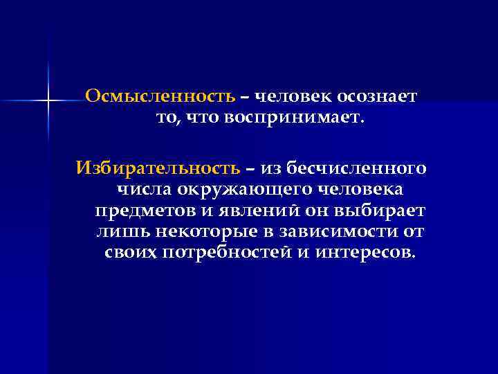 Осмысленность – человек осознает то, что воспринимает. Избирательность – из бесчисленного числа окружающего человека предметов и явлений он выбирает лишь некоторые в зависимости от своих потребностей и интересов.