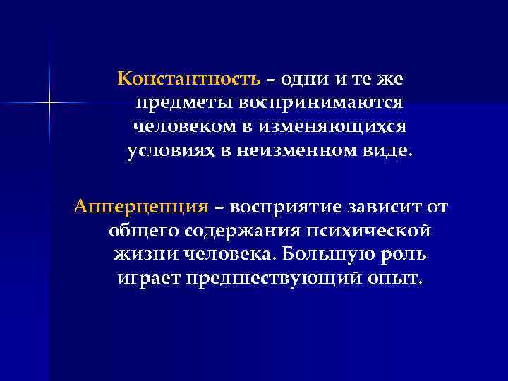 Константность – одни и те же предметы воспринимаются человеком в изменяющихся условиях в неизменном виде. Апперцепция – восприятие зависит от общего содержания психической жизни человека. Большую роль играет предшествующий опыт.