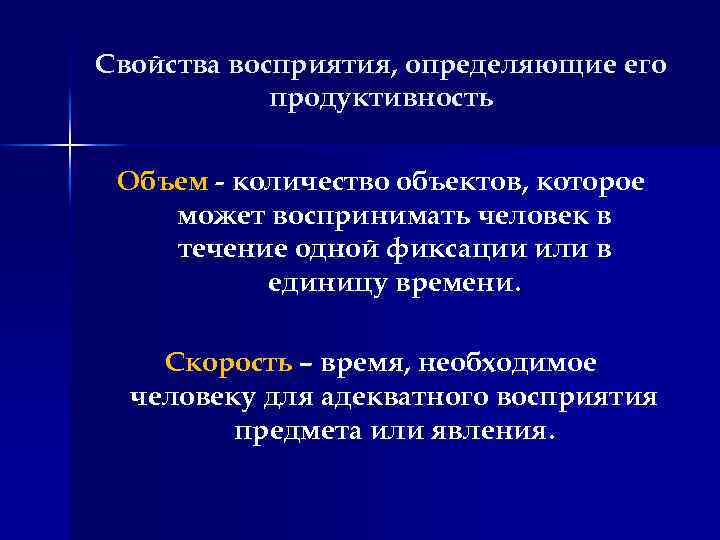Свойства восприятия, определяющие его продуктивность Объем - количество объектов, которое может воспринимать человек в течение одной фиксации или в единицу времени. Скорость – время, необходимое человеку для адекватного восприятия предмета или явления.