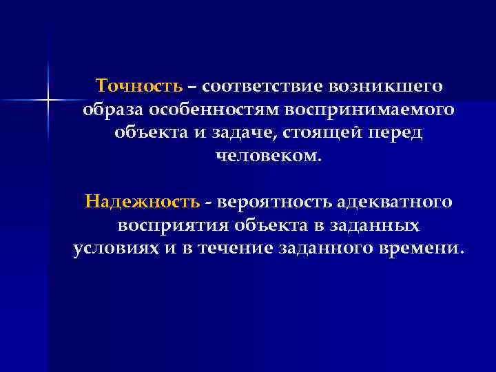Точность – соответствие возникшего образа особенностям воспринимаемого объекта и задаче, стоящей перед человеком. Надежность - вероятность адекватного восприятия объекта в заданных условиях и в течение заданного времени.