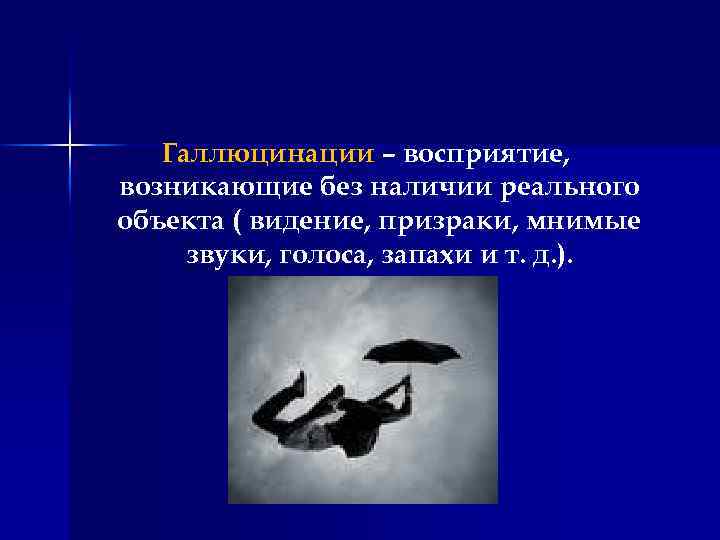 Галлюцинации – восприятие, возникающие без наличии реального объекта ( видение, призраки, мнимые звуки, голоса, запахи и т. д. ).