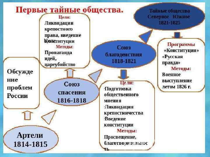 4. Программным документом Южного общества стал проект П. И. Пестеля: “Русская идея” “Русская мысль” “Русская правда” “Новая Русь” “Святая Русь” 5. В 1821 – 1822 гг. возникли два тайных общества – Северное в Петербурге и Южное в: Киеве Одессе Чернигове армейских частях на Украине Николаеве 6. Программным документом Северного общества стала “Конституция”, разработанная: Н. М. Муравьевым А. Н. Муравьевым П. И. Пестелем Е. П. Оболенским А. А. Бестужевым