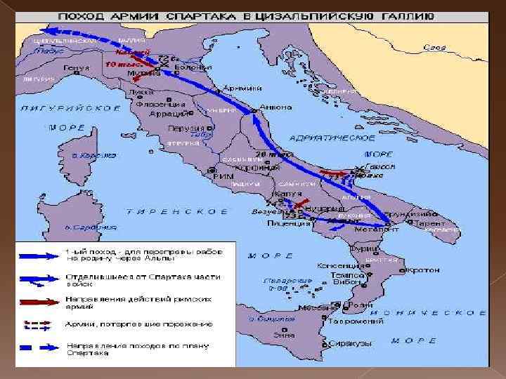 Расширение восстания. К Спартаку присоединялись все новые рабы и крестьяне. В скором времени в отряде было уже более 10 000 человек. Римский сенат послал новую сильную армию. Но и она потерпела поражение. Римские наемники не хотели сражаться, многие из них переходили на сторону Спартака. Численность его армии быстро росла и составляла до 120 тысяч человек. Спартак не хотел брать штурмом Рим. Он собирался дать рабам возможность вернуться на родину. Поэтому основные силы под командованием Спартака двинулись на север, а небольшой отряд восставших остался на юге. Отряд рабов, оставшийся на юге, был разбит. Спартак повернул обратно для того, чтобы вернуться на юг и поднять восстание среди сицилийских рабов.