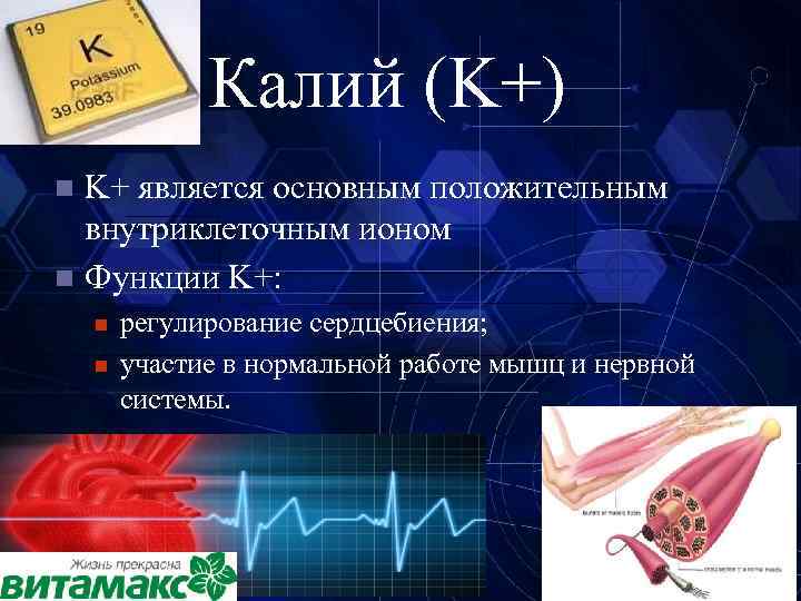 Калий (K+) K+ является основным положительным внутриклеточным ионом n Функции K+: n n n регулирование сердцебиения; участие в нормальной работе мышц и нервной системы. 10