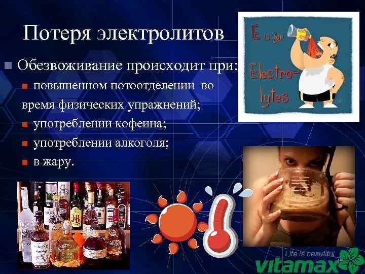 Потеря электролитов n Обезвоживание происходит при: повышенном потоотделении во время физических упражнений; n употреблении кофеина; n употреблении алкоголя; n в жару. n 15