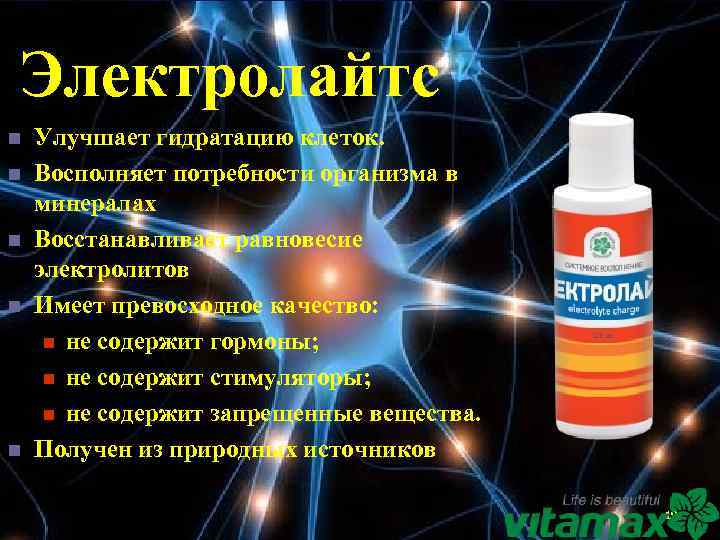 Электролайтс n n n Улучшает гидратацию клеток. Восполняет потребности организма в минералах Восстанавливает равновесие электролитов Имеет превосходное качество: n не содержит гормоны; n не содержит стимуляторы; n не содержит запрещенные вещества. Получен из природных источников 19