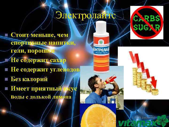 Электролайтс n n n Стоит меньше, чем спортивные напитки, гели, порошки Не содержит сахар Не содержит углеводов Без калорий Имеет приятный вкус воды с долькой лимона 20