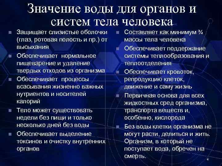 Значение воды для органов и систем тела человека n n n Защищает слизистые оболочки (глаз, ротовая полость и пр. ) от высыхания Обеспечивает нормальное пищеварение и удаление твердых отходов из организма Обеспечивает процессы всасывания жизненно важных нутриентов и носителей калорий Тело может существовать недели без пищи и только несколько дней без воды Обеспечивает выделение токсинов и очистку внутренних органов n n n Составляет как минимум ¾ массы тела человека Обеспечивает поддержание системы теплообразования и теплоотделения Обеспечивает кровоток, репродукцию клеток, движение и саму жизнь Первичная основа для всех жидкостных сред организма, транспорта веществ и, особенно, кислорода Без воды клетки организма не могут расти, делиться и жить. Организм, в который не поступает вода, обречен на смерть. 4