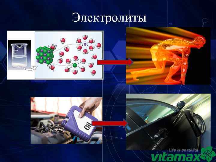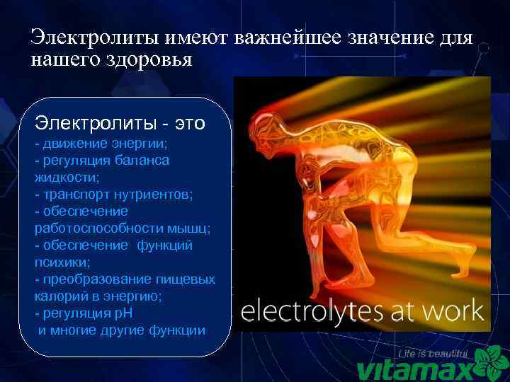 Электролиты имеют важнейшее значение для нашего здоровья Электролиты - это - движение энергии; - регуляция баланса жидкости; - транспорт нутриентов; - обеспечение работоспособности мышц; - обеспечение функций психики; - преобразование пищевых калорий в энергию; - регуляция р. Н и многие другие функции 7