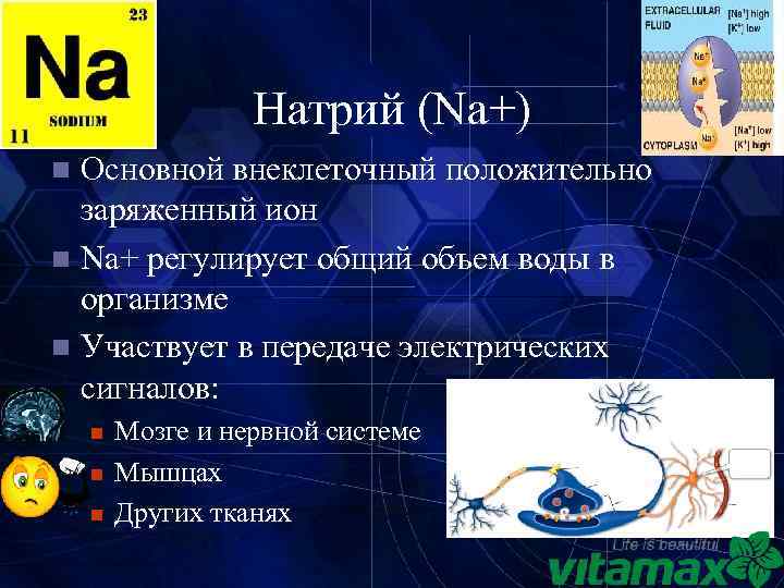 Натрий (Na+) Основной внеклеточный положительно заряженный ион n Na+ регулирует общий объем воды в организме n Участвует в передаче электрических сигналов: n n Мозге и нервной системе Мышцах Других тканях 9