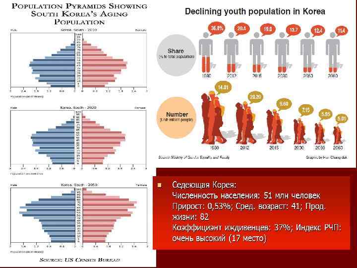 Дряхлеющая Япония: Численность населения: 126, 7 млн человек Прирост: -0, 19%; Сред. возраст: 47; Прод. жизни: 85 Коэффициент иждивенцев: 64, 5%; Индекс РЧП: очень высокий (20 место) Северная Корея на перепутье: Численность населения: 25 млн человек Прирост: 0, 53%; Сред. возраст: 34; Прод. жизни: 70 Коэффициэнт иждивенцев: 44%; Индекс РЧП: нет данных