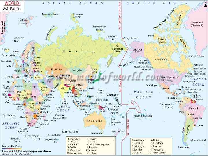 ЮВА Индокитай: Вьетнам, Лаос, Камбоджа, Tаиланд, Мьянма МЮВА: Сингапур, Малайзия, Индонезия, Бруней, Филиппины, Южная Пацифика В. Тимор Австралия Новая Зеландия Папуа Новая Гвинея Зап. Самоа Соломоновы острова Фиджи Тувалу Тонга Науру, Кирибати Вануату, Палау и др. СВА Россия Китай Япония Ю. Корея С. Корея Тайвань Монголия Северная Америка (США, Канада, Мексика) Центрально и южноамериканские государства