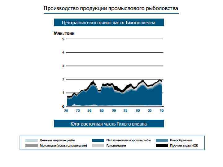 География морских уловов по рыбопромысловым районам ФАО Океаны и районы Объем уловов в 1990 г. , тыс. т 2009 г. 2004 г. Объем тыс. т уловов, %, в мире Мировой океан 79 292 85 793 100 Атлантический 22 644 22 501 26, 2 Северо-Западный 3 252 2 353 2, 7 Северо-Восточный 8 457 9 972 11, 6 Центрально-Западный 1 621 1 653 1, 9 Центрально-Восточный 4 096 3 394 4, 0 Средиземное и Черное море 1 385 1 530 1, 8 Юго-Западный 2 038 1 746 2, 0 Юго-Восточный 1 408 1 727 2, 0 Антарктический 388 126 0, 1 Индийский 6 314 9 780 11, 4 Западный 3 335 4 147 4, 8 Восточный 2 944 5 625 6, 6 34 8 0, 0 Тихий 50 336 53 512 64, 2 Северо-Западный 23 245 21 558 25, 1 Северо-Восточный 3 352 3 051 3, 6 Центрально-Западный 7 548 11 011 12, 8 Центрально-Восточный 1 503 1 704 2, 0 822 737 0, 9 Юго-Восточный 13 864 15 451 18, 0 Антарктический 0, 7 3 0, 0 Объем уловов, тыс. т Антарктический Юго-Западный 1 900