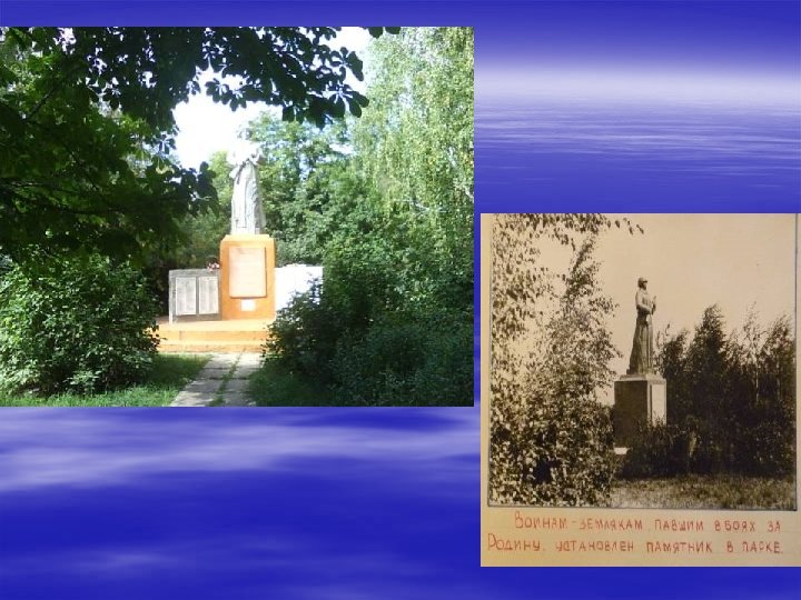 Sightseeings There a lot of interesting places to visit in our village: The monument to soldiers in the Great Patriotic War Our school Our park