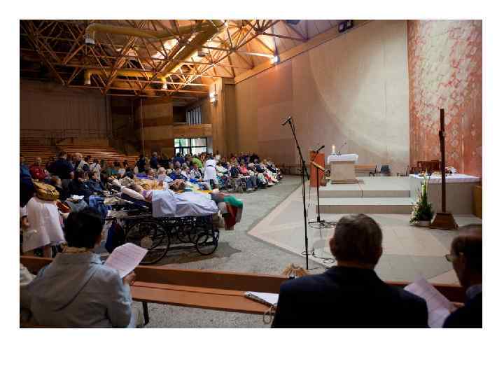 Это подземный храм, где совершаются международные католические мессы. Коляску принимают старшие скауты, они скрепляют рядомстоящие коляски вместе