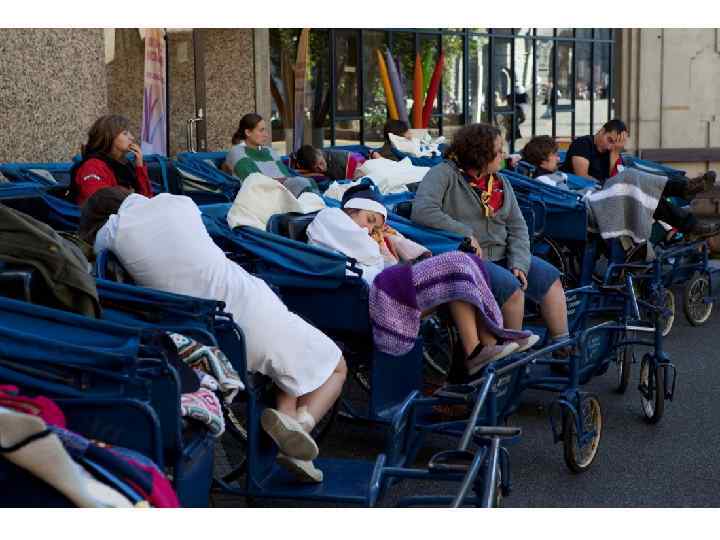 Когда месса закончилась, добровольцы помогают инвалидам укрыться одеялами и дождевиками, на которых написано название госпиталя где они поселились