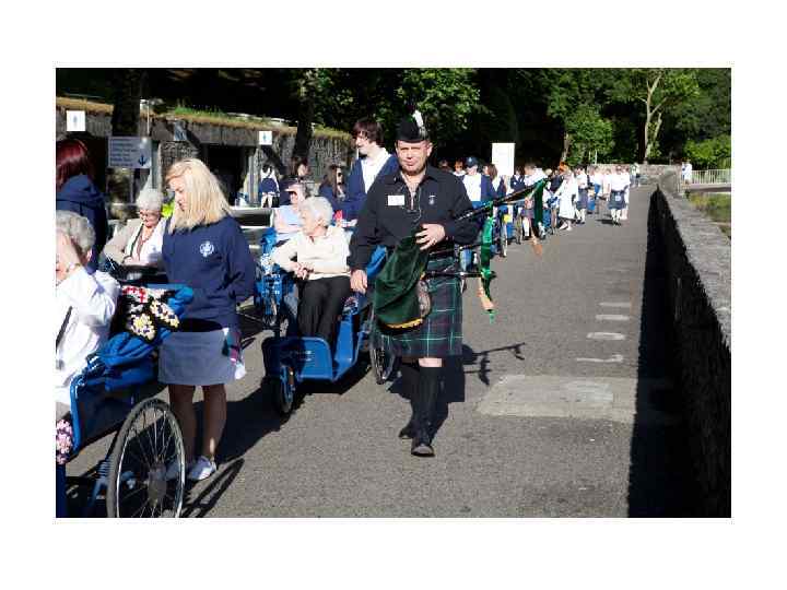 На фото: группа добровольцев из Шотландии. Волонтеры из разных общин стараются показать окружающим из какого города и из какой страны они приехали. Чтобы все знали, что и там тоже есть милосердие. Часто можно встретить отдельного добровольца, который ходит впереди своей группы с флагом Общины. С шотландцами, например, был волынщик - он шел впереди и задолго до приближения группы весь Лурд понимал, что это они - шотландцы