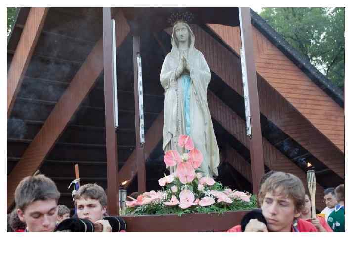 Статую они несут из своего лагеря, сопровождая христианскими песнями, исполняемыми под гитару. Вместе со скаутами идет епископ Тарбский и Лурдский монсеньор Жак Перье