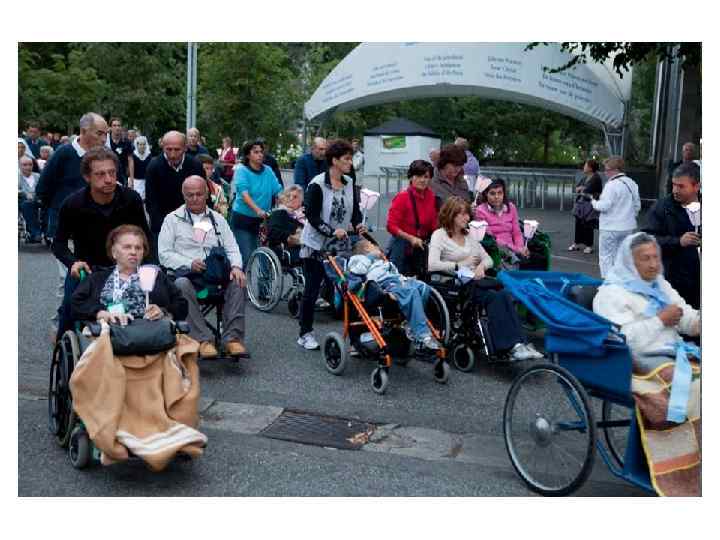 Коляски в Лурде особенные. Если они были куплены на благотворительные деньги (а обычно это именно так), то на коляске бывает написана благодарность или имя человека, сделавшего пожертвование. За техническим состоянием колясок следит группа младших скаутов - они подкачивают колеса, ремонтируют неполадки