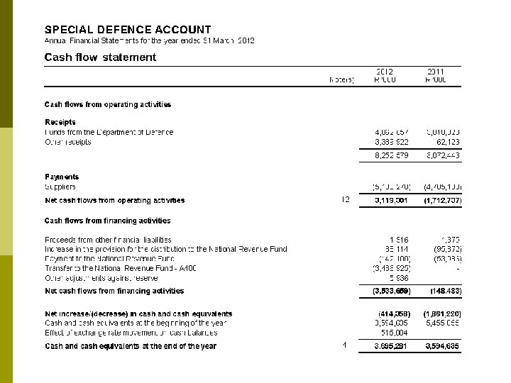 DEPARTMENT OF DEFENCE AND MILITARY VETERANS VOTE 22 Cash Flow Statement for the year ended 31 March 2012 Note CASH FLOWS FROM OPERATING ACTIVITIES Receipts Annual appropriated funds received Departmental revenue received Payments Net decrease/(increase) in working capital Surrendered to Revenue Fund Current payments Payments for financial assets Transfers and subsidies paid 2010/11 R'000 38 539 178 34 349 087 4 190 091 31 109 211 30 442 591 666 620 86 161 (4 270 730) (27 237 446) ( 238 658) (5 877 842) (37 538 515) 1 2 2011/12 R'000 175 860 ( 688 929) (25 546 962) ( 166 999) (3 888 017) (30 115 047) Net cash flows available from operating activities 19 1 000 663 994 164 CASH FLOWS FROM INVESTING ACTIVITIES Payments for capital assets Proceeds from sale of capital assets Net cash flows from investing activities 7 2. 4 ( 977 491) 78 919 ( 898 572) ( 840 393) 23 068 ( 817 325) 34 734 13 837 136 825 ( 476 068) ( 339 243) 190 676 ( 666 744) 19 ( 476 068) CASH FLOWS FROM FINANCING ACTIVITIES Increase/(decrease) in net assets Net cash flows from financing activities Net increase/(decrease) in cash and cash equivalents Cash and cash equivalents at beginning of period Cash and cash equivalents at end of period 20