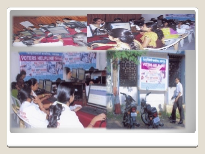 VOTER HELPLINE CALL CENTRES Call centers at all constituencies Central Call Centre at district with 20 lines operational 8 to 8 Peak days operation from 7 to 10 Trained staff and in house search engine development 100 pc Cross evaluation of the communication plan Accolades from people