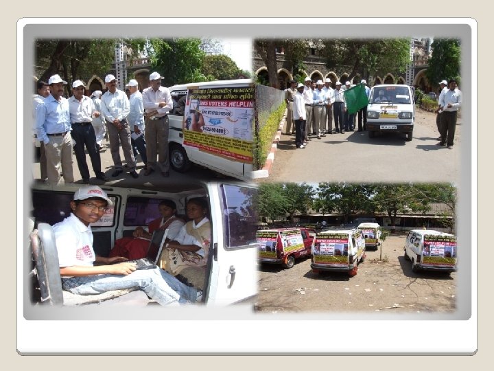 MOBILE VOTER AWARENESS VANS 15 vans ; one for each taluka Equipped with laptops and multimedia gadgets School and college students as volunteers Youth involvement a top priority Chawdi sabha and corner meetings