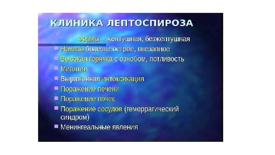 Начальный период. В поражённых органах и тканях развиваются дегенеративные и некротические изменения — гепатоцитов, эпителия почечных канальцев, эндотелия капилляров и эритроцитов, накапливаются токсичные метаболиты. Одновременно нарастают лептоспиремия и токсинемия, генерализация возбудителей по новым органам и системам (надпочечники, ЦНС). Возникают лихорадка, ознобы, миалгии, быстро прогрессируют симптомы интоксикации. Период разгара. Токсинемия, патоморфологические и функциональные изменения в органах достигают максимальной степени. Прогрессирует генерализованный капилляротоксикоз с повышением проницаемости стенок сосудов, нарушениями микроциркуляции и геморрагическими явлениями различной степени выраженности (геморрагическая сыпь на коже и слизистых оболочках, мелкие диапедезные органные кровоизлияния, внутренние и наружные кровотечения). Поражения печени обусловлены механическим повреждением гепатоцитов активно подвижными лептоспирами, токсическим действием эндотоксина, выделяющегося при гибели бактерий, что может приводить к развитию желтухи.